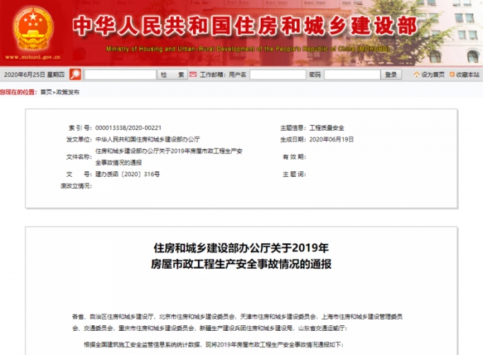 日前,住建部辦公廳下發(fā)《關(guān)于2019年房屋市政工程生產(chǎn)安全事故情況的通報》,要求,2020年,各地要深入查找本地區(qū)安全生產(chǎn)工作的薄弱環(huán)節(jié)和突出問題,推動防范化解施工安全重大風(fēng)險各項(xiàng)部署落地見效,堅決遏制重特大事故。