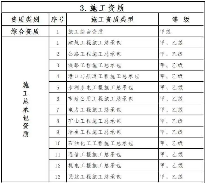 保留原12類施工總承包資質(zhì),將機(jī)場(chǎng)場(chǎng)道工程專業(yè)承包資質(zhì)、民航空管工程及機(jī)場(chǎng)弱電系統(tǒng)工程專業(yè)承包資質(zhì)和機(jī)場(chǎng)目視助航工程專業(yè)承包資質(zhì)等合并為民航工程施工總承包資質(zhì),取得上述3個(gè)專業(yè)承包資質(zhì)中的任一個(gè),即可換發(fā)民航工程施工總承包資質(zhì)。施工總承包資質(zhì)等級(jí)壓減為甲、乙兩級(jí),甲級(jí)資質(zhì)在本類別內(nèi)承攬業(yè)務(wù)規(guī)模不受限制,原一級(jí)資質(zhì)調(diào)整為甲級(jí)資質(zhì),其他等級(jí)資質(zhì)合并為乙級(jí)資質(zhì)。