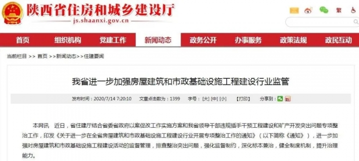 7月14日,陜西省住房和城鄉(xiāng)建設(shè)廳官網(wǎng)發(fā)布消息稱,近日印發(fā)了《關(guān)于進一步在全省房屋建筑和市政基礎(chǔ)設(shè)施工程建設(shè)行業(yè)開展專項整治工作的通知》(以下簡稱《通知》),加強對房屋建筑和市政基礎(chǔ)設(shè)施工程建設(shè)活動的監(jiān)督管理。