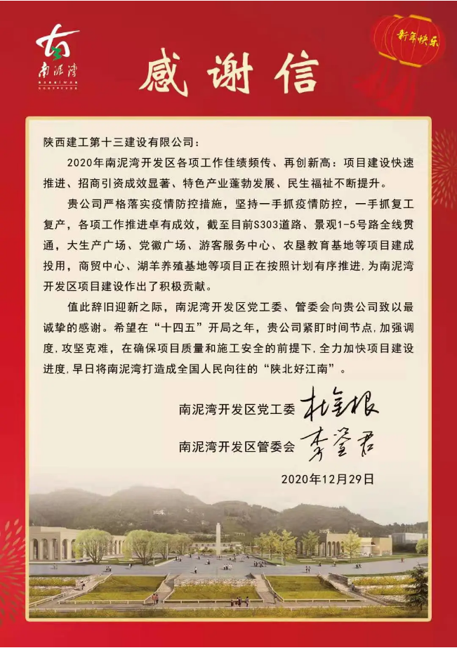 感謝信中提到,2020年陜建十三建公司嚴格落實疫情防控措施,堅持一手抓疫情防控,一手抓復工復產,各項工作推進卓有成效,截止目前S303道路、景觀1-5號路全線貫通,大生產廣場、黨徽廣場、游客服務中心、農墾教育基地等項目建成投用,商貿中心、湖羊養(yǎng)殖基地等項目正在按照計劃有序推進,為南泥灣開發(fā)區(qū)項目建設作出了積極貢獻。
