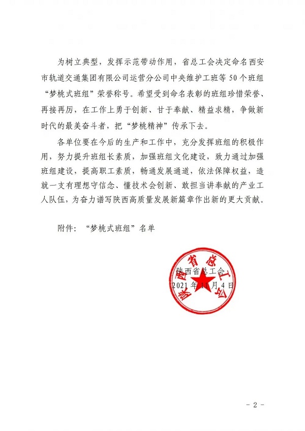 為進(jìn)一步傳承和弘揚(yáng)“高標(biāo)準(zhǔn)、嚴(yán)要求、行動快、工作實(shí)、搶困難、送方便”和“不讓一個伙伴掉隊”的“夢桃精神”,近日,陜西省總工會對全省50個優(yōu)秀班組進(jìn)行了榮譽(yù)表彰,授予他們“夢桃式班組”榮譽(yù)稱號,集團(tuán)延安南泥灣勞模工匠學(xué)院項目科技創(chuàng)新班組獲此殊榮。